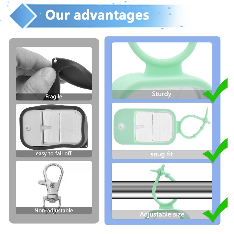 - Durable & Premium Quality The hand sanitizer spray case is made of premium silicone material, odorless, safety, lightweight, durable, and reusable. The silicone keychain can hold the sanitizer bottle tightly in place so it won't fall off