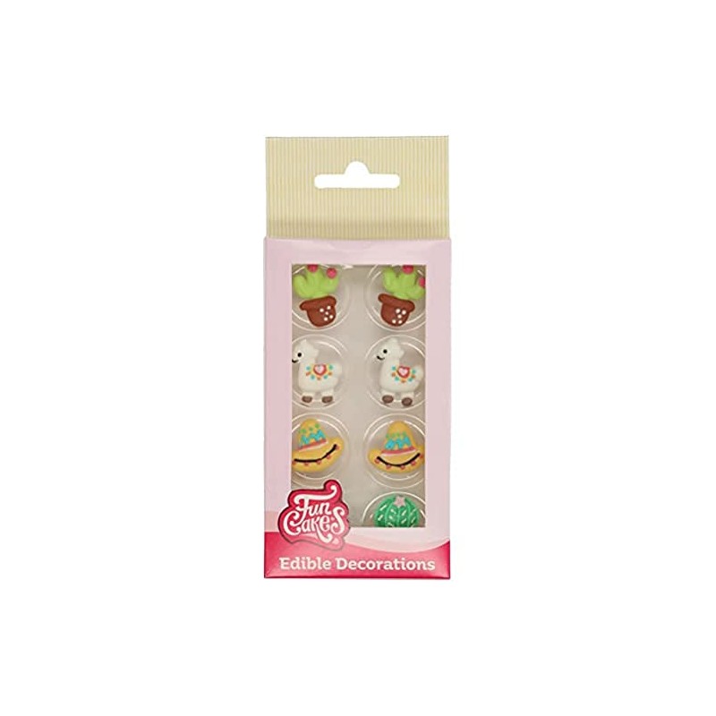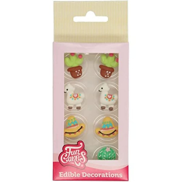 - Includes 4 assorted decorations (2 each): light green cactus, alpaca, Mexican hat, dark green cactus.