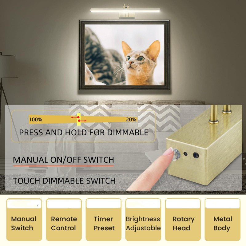 - Brightness Dimmable Wall Art Light - Long press the manual switch of painting light or use the remote control to adjust the brightness smoothly from 20%-100%.
