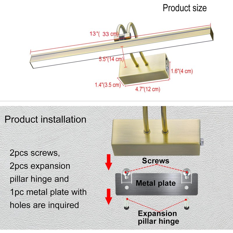 - 13inches Metal Wireless Picture Lights for Wall - Full metal body, lighting direction can be adjusted at 150° up and down. 13 inches long lamp tube, perfect for dart board,picture frame, portrait,artworks,headboard pictures,mirror,photos,poster,diplomas,bookcase & jewelry display etc.