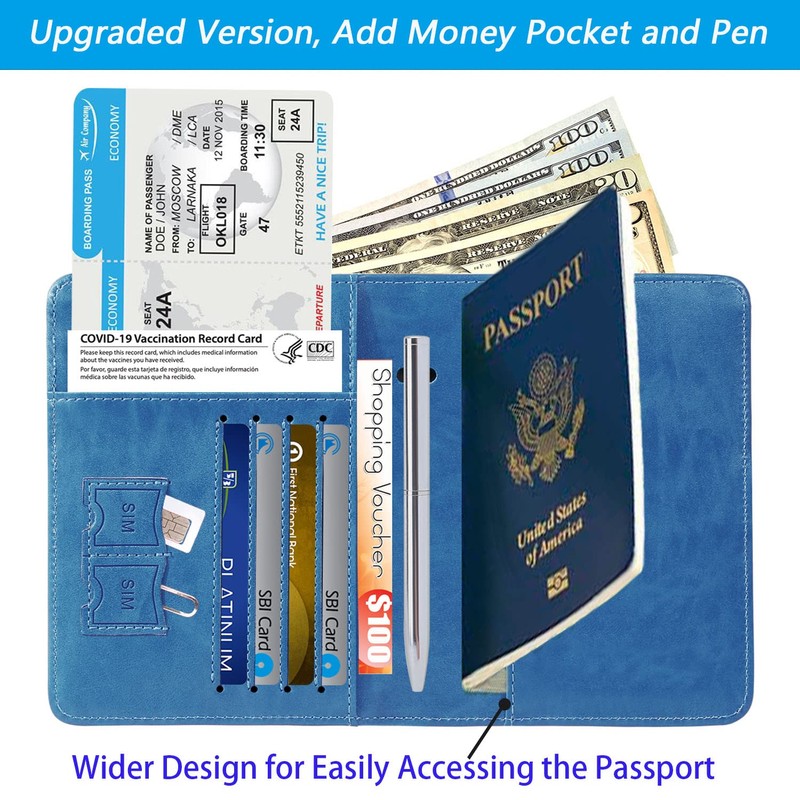 - Imprescindible para viajar: en comparación con la mayoría de los soportes de pasaporte en el mercado, nuestra versión de portafolios de pasaporte de gran capacidad tiene un bolsillo extra para dinero y un bolígrafo de metal. Es un gran soporte para artículos esenciales de viaje. Sin embargo, con el elástico multifuncional, puedes poner la funda para pasaporte en un bolsillo, engancharla en la mano o en la barra de tracción de la veliz y saber que es segura.