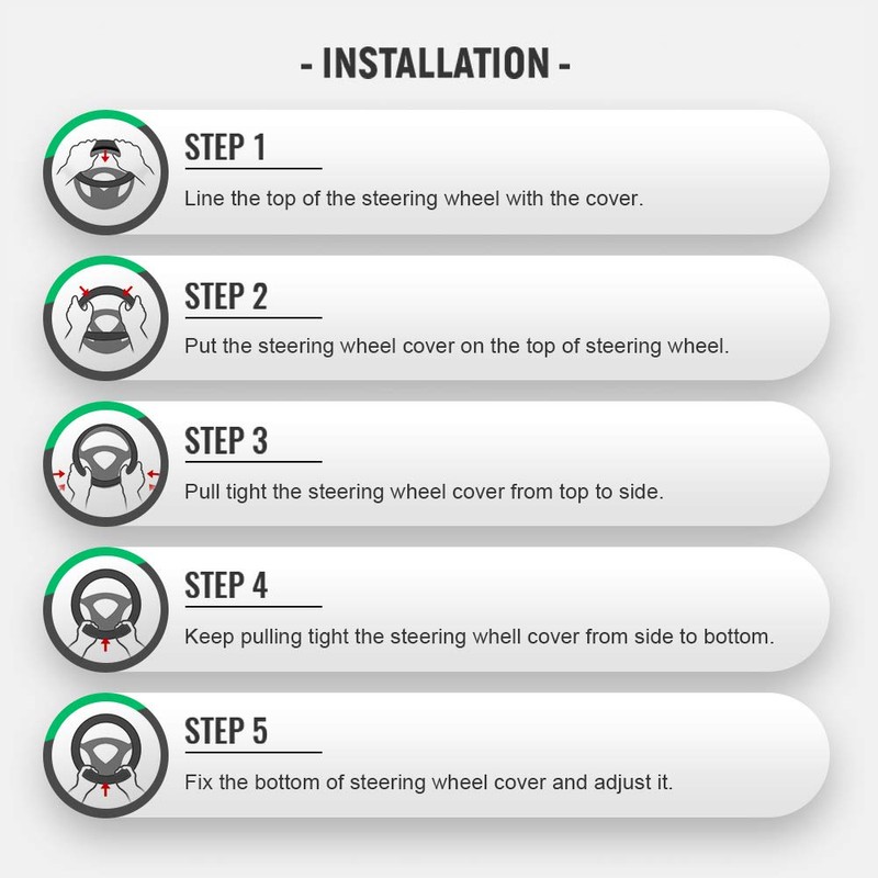 - Transpirable y duradero: la superficie transpirable mantiene las palmas lejos del sudor de la mano. La piel de microfibra hace que la funda del volante sea duradera.