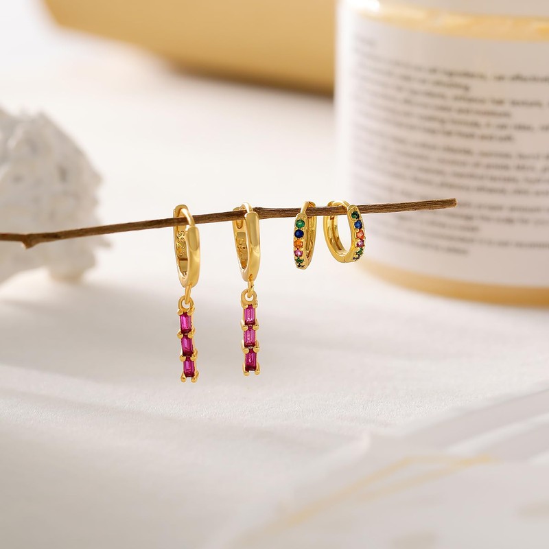 - Drop earring set: one package contains 2 pairs of earrings in the same colour, earrings studs, drop earrings gold, emerald drop earrings and rhinestone earrings green blue. These can be worn at the same time as earrings for several pierced ears to create your own unique style. The cubic zirconia hoop earrings measure 10 mm in diameter, the dangle hoop earrings are 13 mm in diameter and suitable for most women and girls.