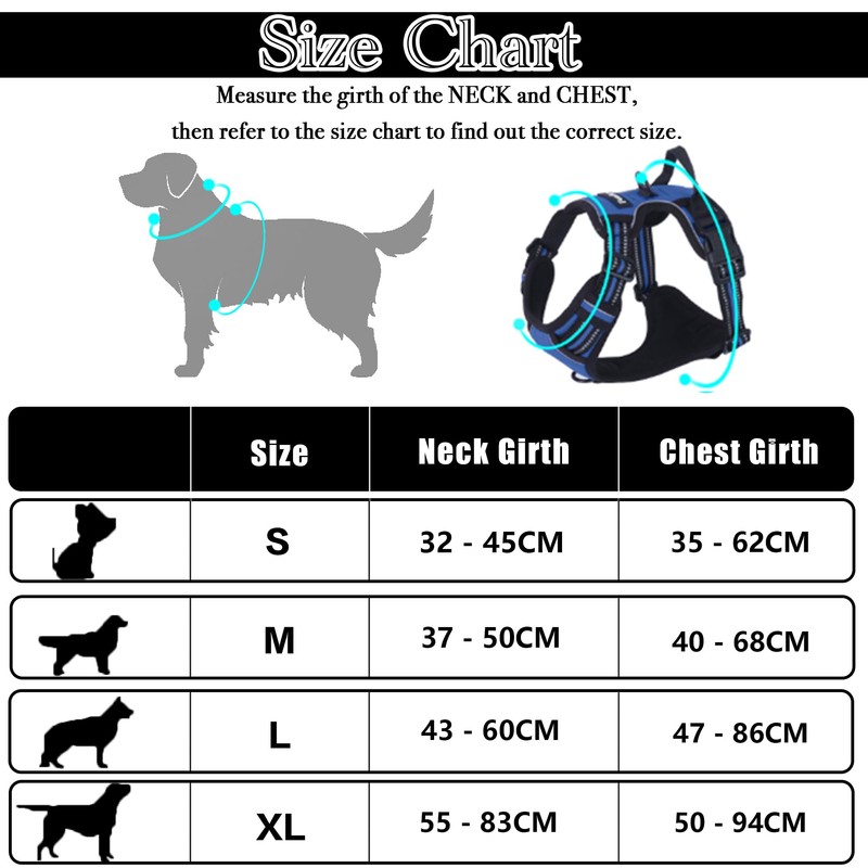 - CHOOSE PROPER SIZE: Recommended medium breed dogs. Measure the girth of the NECK and CHEST, then refer to the size chart to find out the correct size. The harness can be adjusted to maximize the comfort of your doggie. If you have any questions, please feel free to contact us, and we guarantee to provide you with the best quality service.