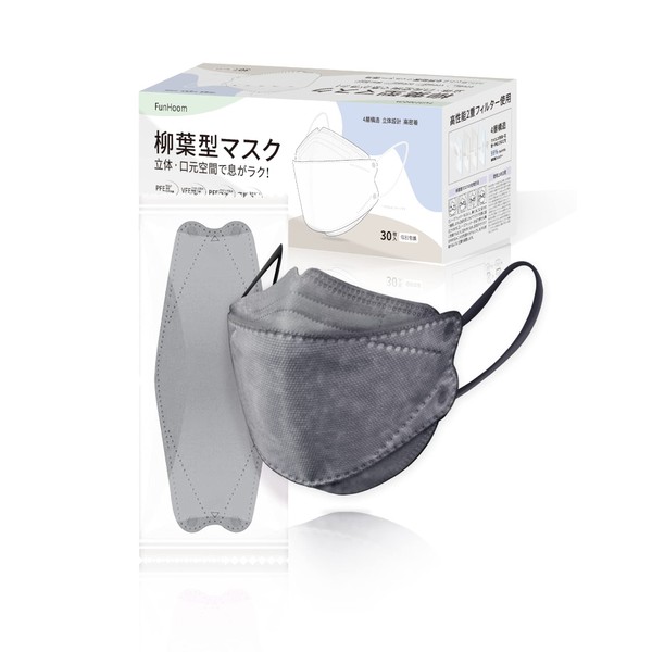 FunHoom KF94 Non-Woven Mask, 30 Pieces, Individually Packaged, 4-Layer Construction, Disposable, Non-Woven Mask, Complexion Color Mask, Anti-Fog, Unisex, 3D Fashion Mask, Gray