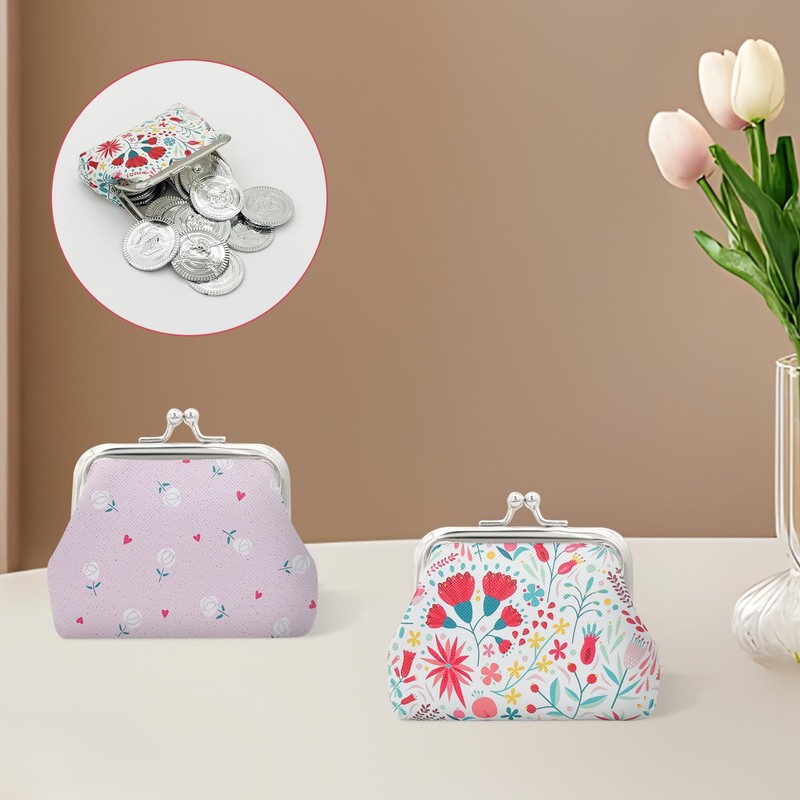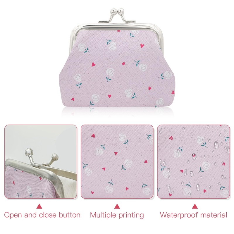 FuninCrea 2 Pcs Faux Leather Coin Purse for Women with Kiss Lock, Floral Pattern Change and Coin Wallet Double Clasp Closure Mini Wallet for Cash Key, Pink+white