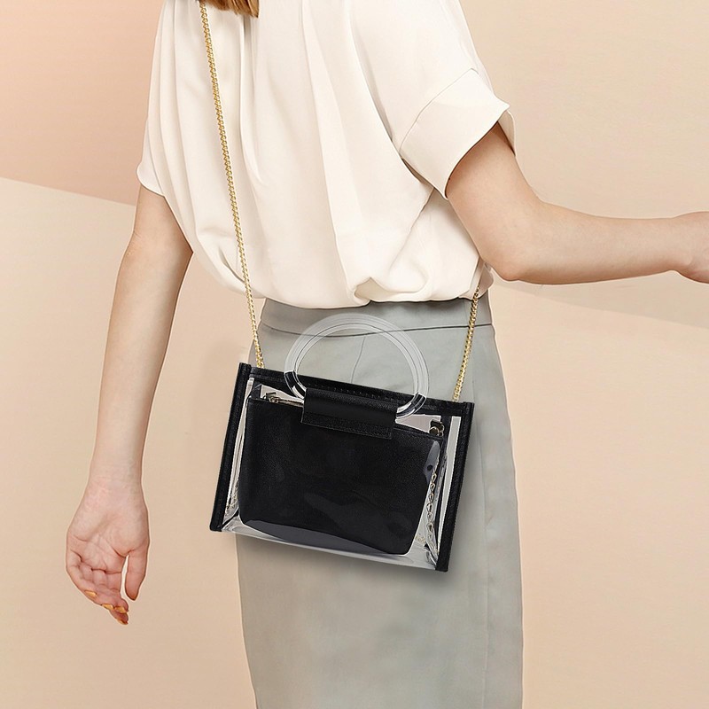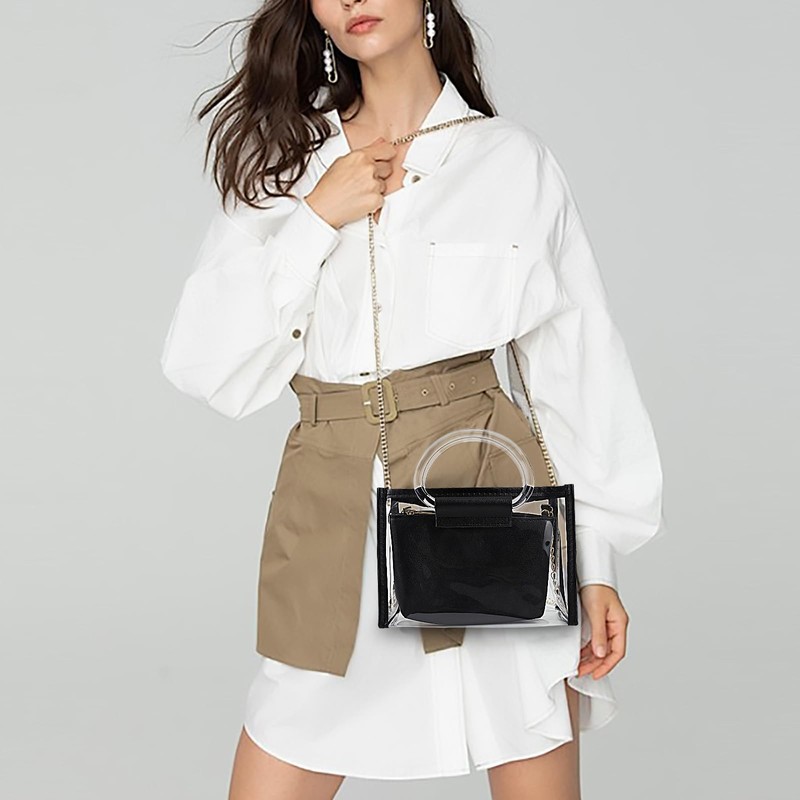 - Transparent PVC Material: The womens handbag is made of transparent PVC with PU leather trim, which is lightweight and waterproof. Its transparent appearance makes it convenient to check if you have everything you need before going out, and can quickly pass through security checks, gymnasium, and other occasions