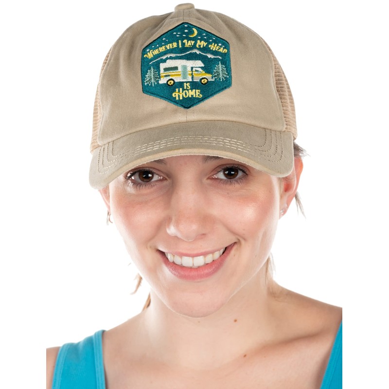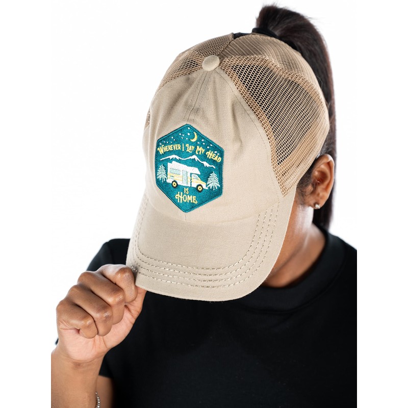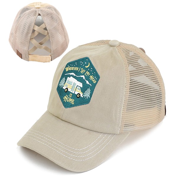 Funky Junque Criss Cross Hat Womens Baseball Cap Distressed Ponytail - Wherever I Lay My Head is Home - Khaki