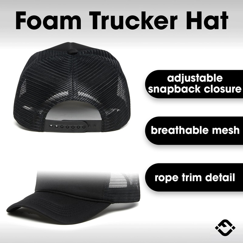 - GREAT LOOK: The low-profile structured bill adds a touch of sophistication to your look, while the foam front panel ensures a seamless and comfortable fit. Available in a variety of solids as well as classic two-toned styles, our Trucker Caps come in a range of colors that are sure to turn heads. Whether you're looking to make a statement or prefer a more understated look, we have the perfect color to match your style.