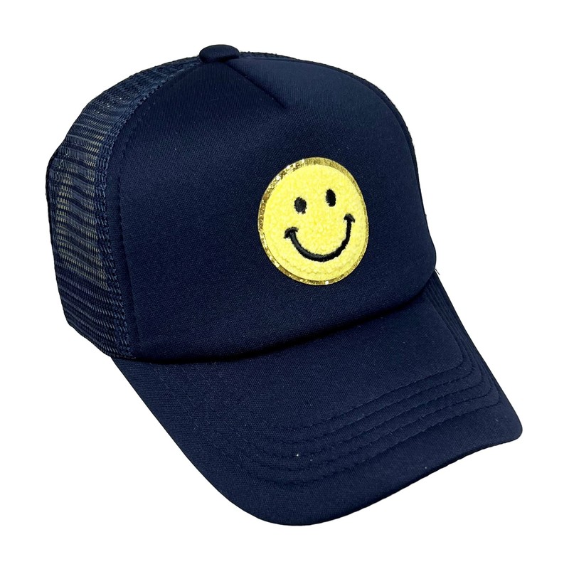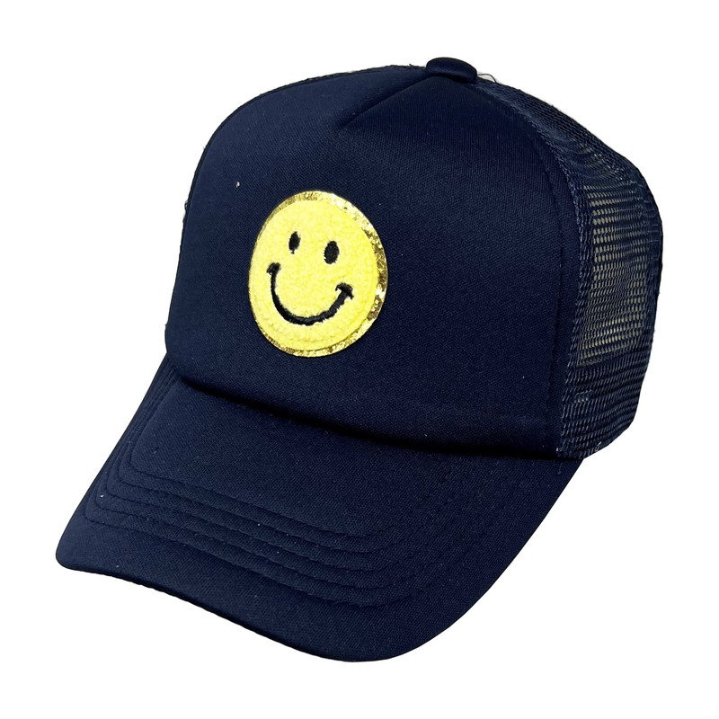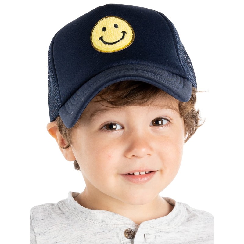 Funky Junque Kids Trucker Hat Adjustable Mesh Snapback Cap Toddler Boys Ages 2-10 - Smiley - Navy/Yellow