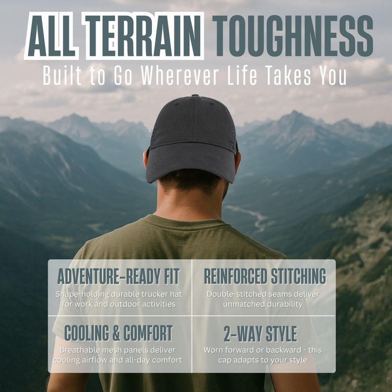- CAP THAT KEEPS YOUR HEAD COOL DURING OUTDOOR ACTIVITIES: Stay cool even on the hottest days with this breathable mesh back trucker hat designed for all your outdoor pursuits. Whether you're hiking, fishing, or just enjoying a sunny stroll, this mesh baseball cap promotes airflow and prevents overheating. The structured front and ventilated mesh panels make it ideal for all-day wear. Rugged yet refined, it offers cooling comfort without compromising on durability or fit.