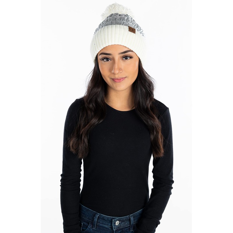 - GREAT QUALITY: This trendy puffer pom hat is 60% polyester and 40% Acrylic and includes cozy features such as puffer-like baffling, a knit pom and cuff, and a super soft fleece lining for all day comfort. Unlike most fabrics that absorb moisture, our beanie repels moisture and dries quickly so you can stay dry and avoid stains. Hand wash cold. Lay out or hang to dry.