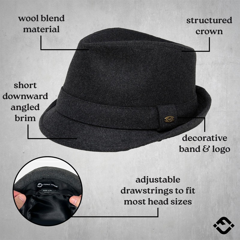 - GREAT QUALITY: You’ll want to take this durable, dazzling grey fedora hats for men everywhere you go. Made with a blend of 50% wool and 50% polyester, these short-brim trilby hats for men are designed to withstand the elements while maintaining a stylish appearance. The high-quality materials of this charcoal grey fedora ensures it retains its shape over time. The intricate craftsmanship imparts the perfect blend of prestige with impeccable taste. Hand wash only to prolong its lifespan.