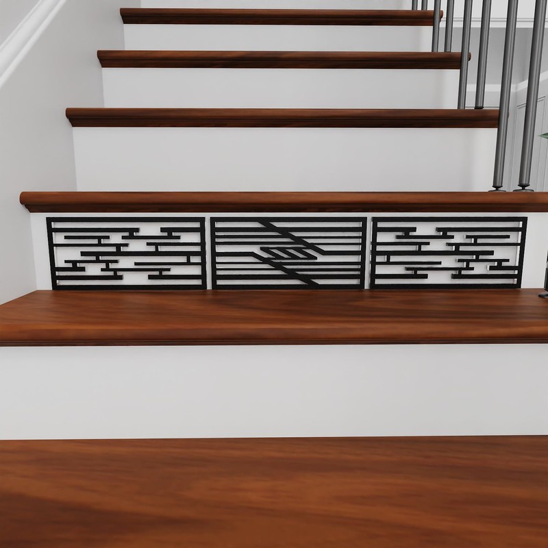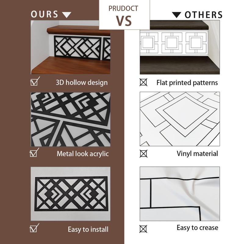 - Advantages: Unlike flat printed vinyl stickers, our stair riser panel accent feature a unique 3D hollow-cut design made from long-lasting, metal-look acrylic plastic. Easy to install while not easy to crease. instantly transforming your stairs into a modern statement piece without permanent renovation