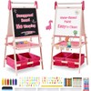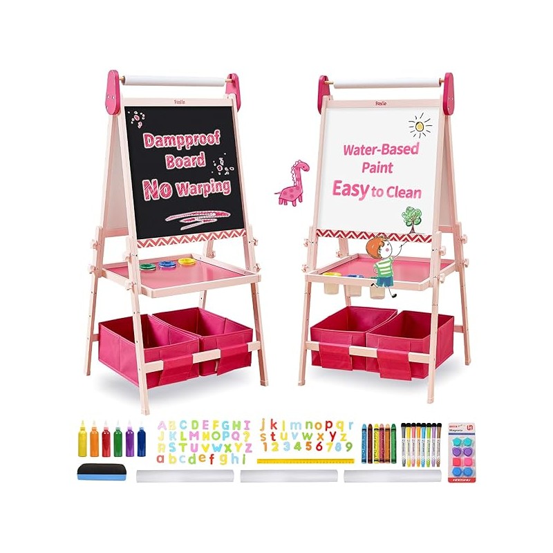 FUNLIO Anti-Warping Kids Art Easel, 3 Height Adjustable for Kids Aged 2-8, All-in-One Toddler Easel with Paper Roll & Erasable Frame, Standing Easel with Magnetic Chalkboard/Whiteboard (Pink)