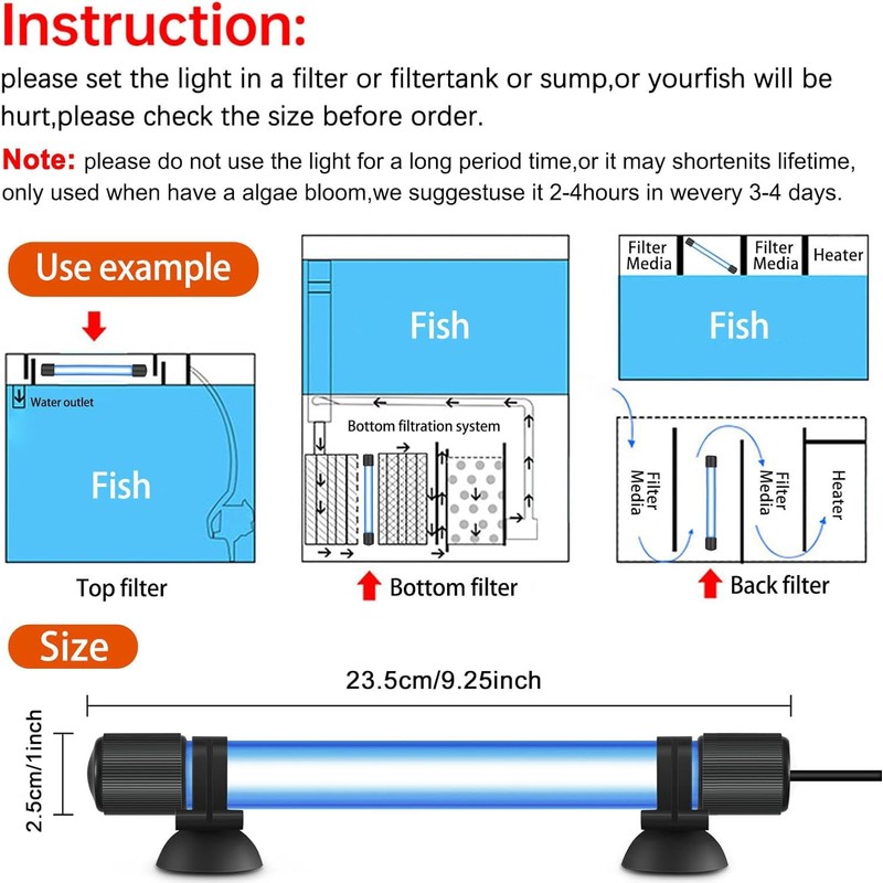 Please note: 1. This product due to the emission of ultraviolet germicidal algae, please do not observe directly through the naked eye, direct irradiation will hurt human eyes and skin, please pay attention to protection. Germicidal lamp can only be used in the filter tank, prohibit direct irradiation of living beings.