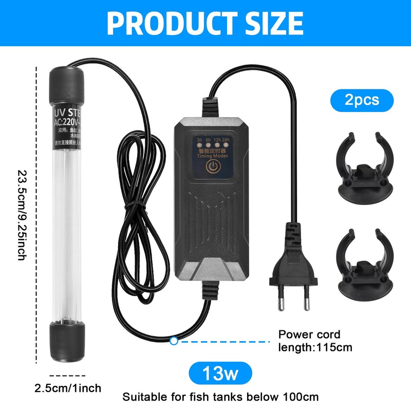 • Safety design: the two ends of the UV disinfection lamp for aquariums are equipped with thickened protective caps that increase waterproofing. Equipped with a practical timer, the lamp can be automatically switched off after a preset time. This allows safe and convenient control of UV radiation in the aquarium.