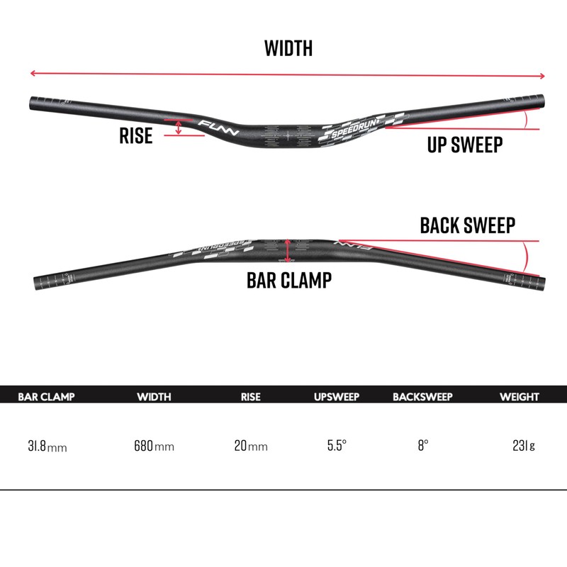 - The Speedrun bike handlebar, made from AL6061 triple-butted aluminum, is designed for compatibility with a 31.8mm bar clamp and 19mm inner diameter grips. To ensure a proper fit, please measure your stem and grip clamp sizes before purchasing.