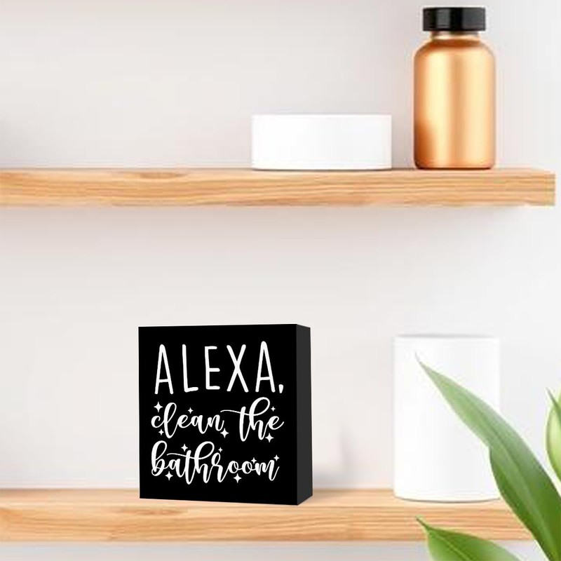 Funny Black Wood Sign Alexa Clean the Bathroom - Wooden Block Sign for Shelf, Toilet, Restroom, Home, Tabletop, Desk Decor - Farmhouse Style