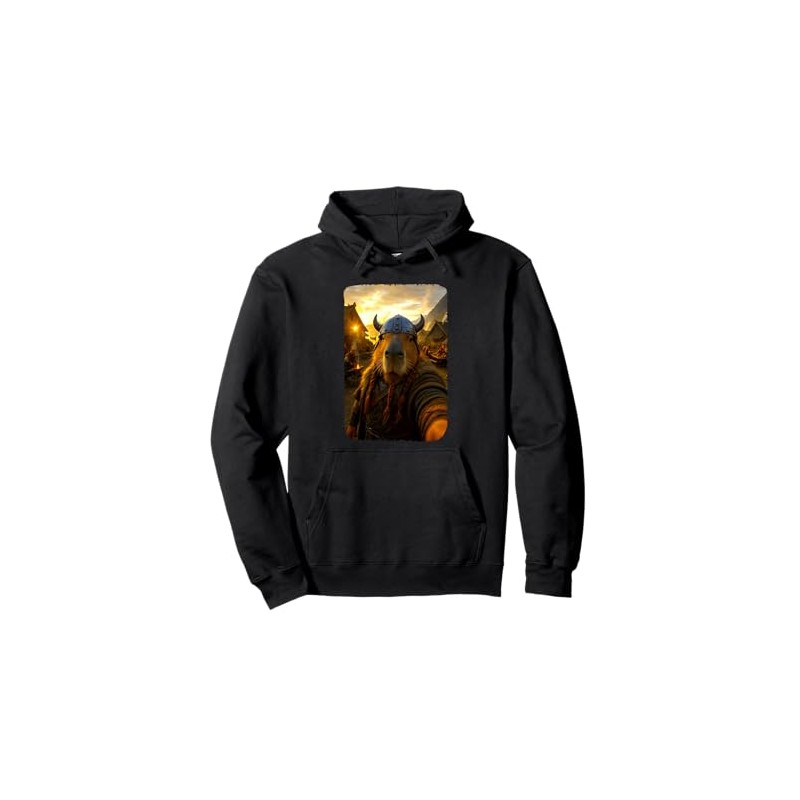 • This bold design features a fierce capybara in full Viking gear, complete with braided beard and horned helmet, snapping a selfie at a rustic village at sunset. A fun blend of historical drama and animal humor.