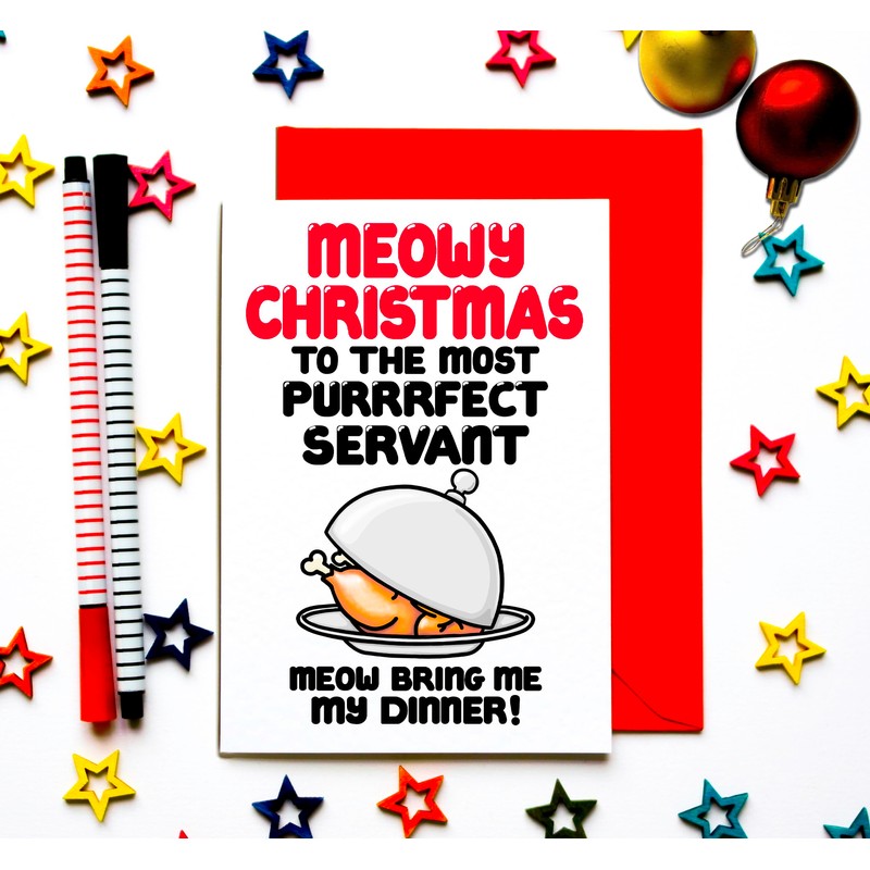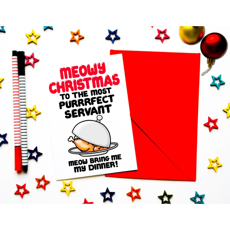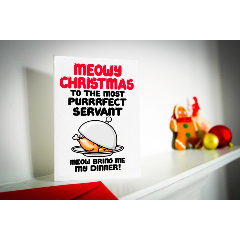 - Humorous Design: This A6-sized (10.5 x 14.8 cm) Christmas card features a quirky design with a cat-themed pun, perfect for cat parents and pet lovers. The card's message, 'Meowy Christmas to the Most Purrrfect Servant, Meow Bring Us Our Dinner!', adds a touch of humour and playfulness.