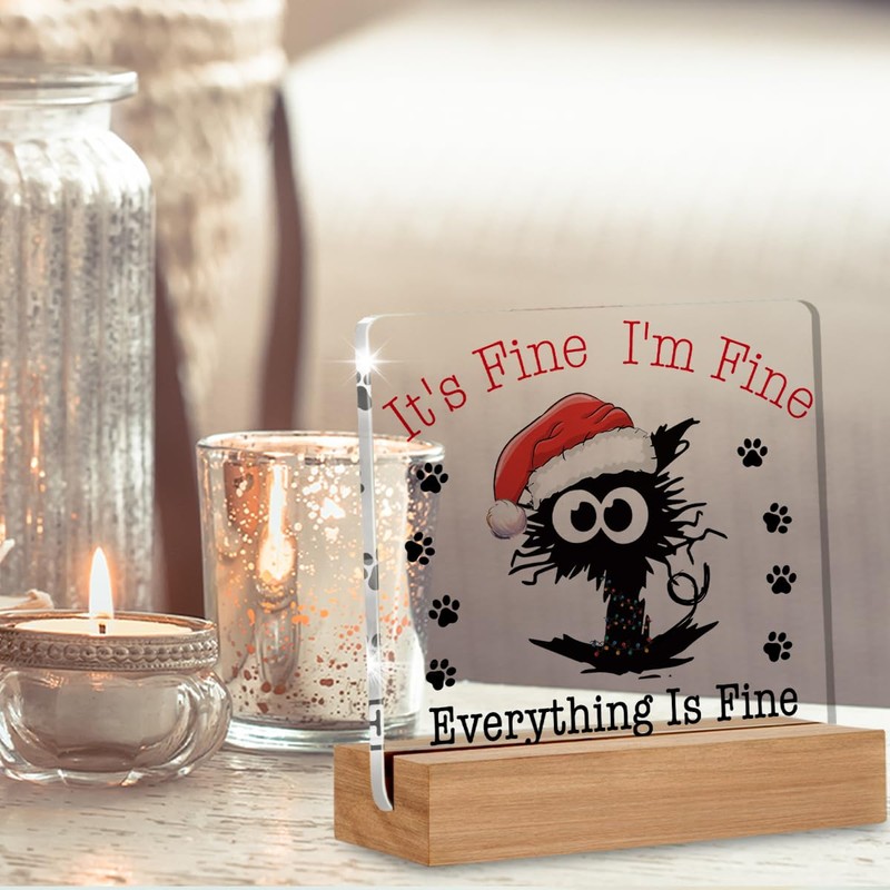 Funny Christmas Gifts, Christmas Cat Decorations for Home, Everything is Fine Home Office Decor Desk Signs Plaques 4 × 4 Inches Acrylic
