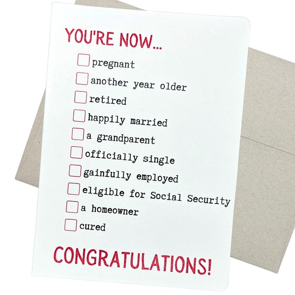 Funny Congratulations Card with Envelope (5X7 Inches and Blank Inside for All Occasions) Silly checklist for pregancy, retirement, new grandparent, newly single, new job, housewarming and others - 265