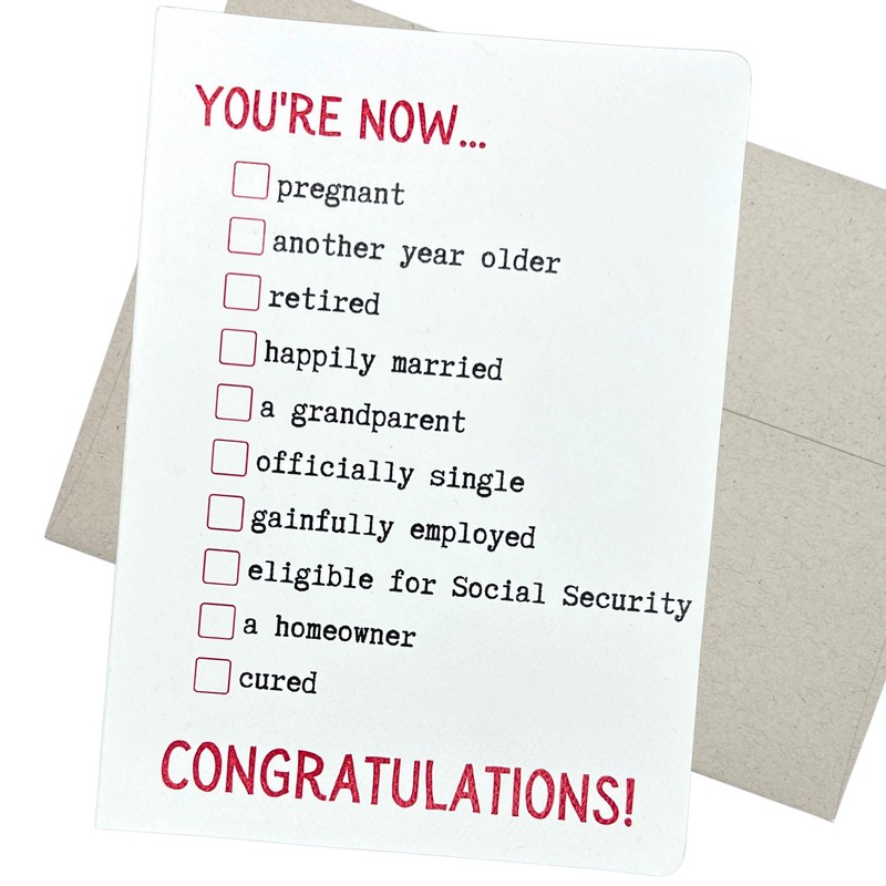 - Checklist style hillarious card for many occastions. Buy several to keep them at home and to give to a friend or family member who has retired, had a birthday, is going to have a baby, got dumped, is old enough for social security, owns a new house, condo or townhouse, and is cured from illness