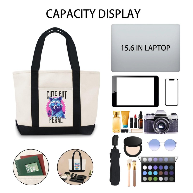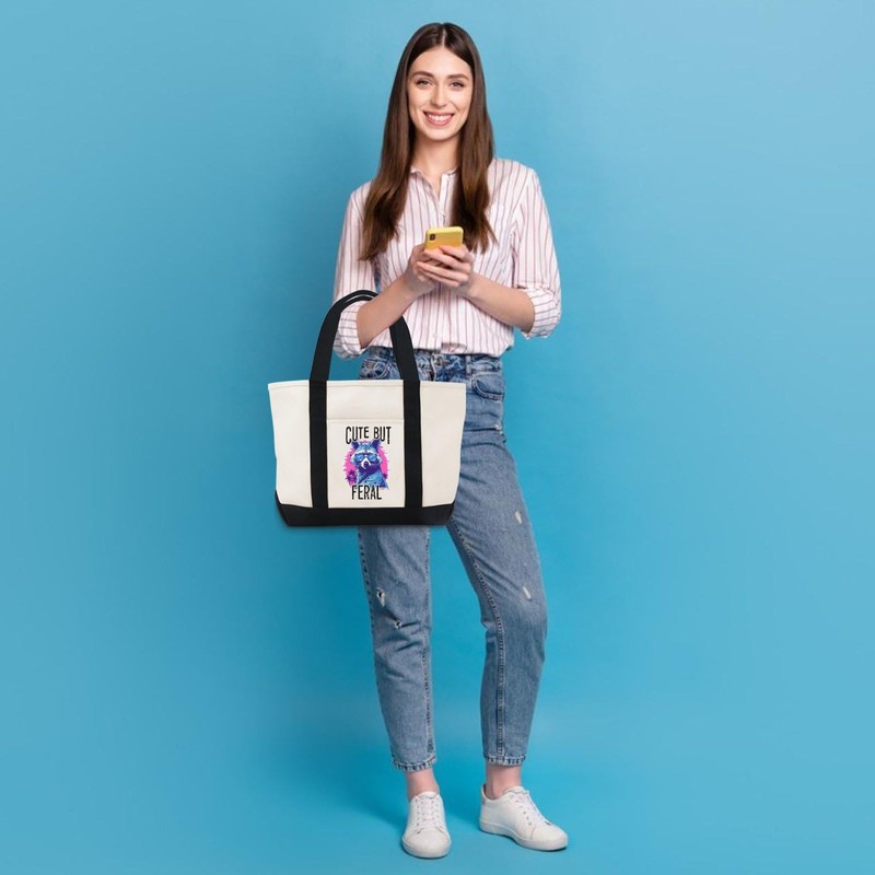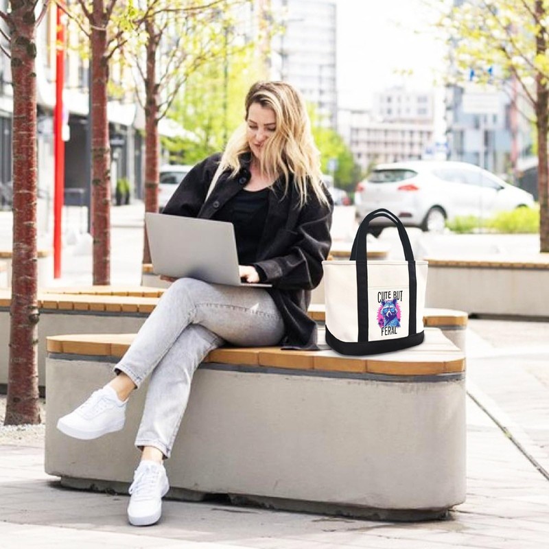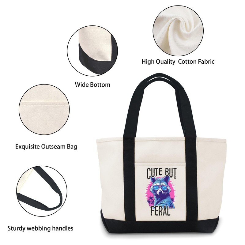 • Stylish Design: This canvas tote bag features a trendy 'Cute but Feral' print with a raccoon wearing sunglasses, perfect for everyday use.