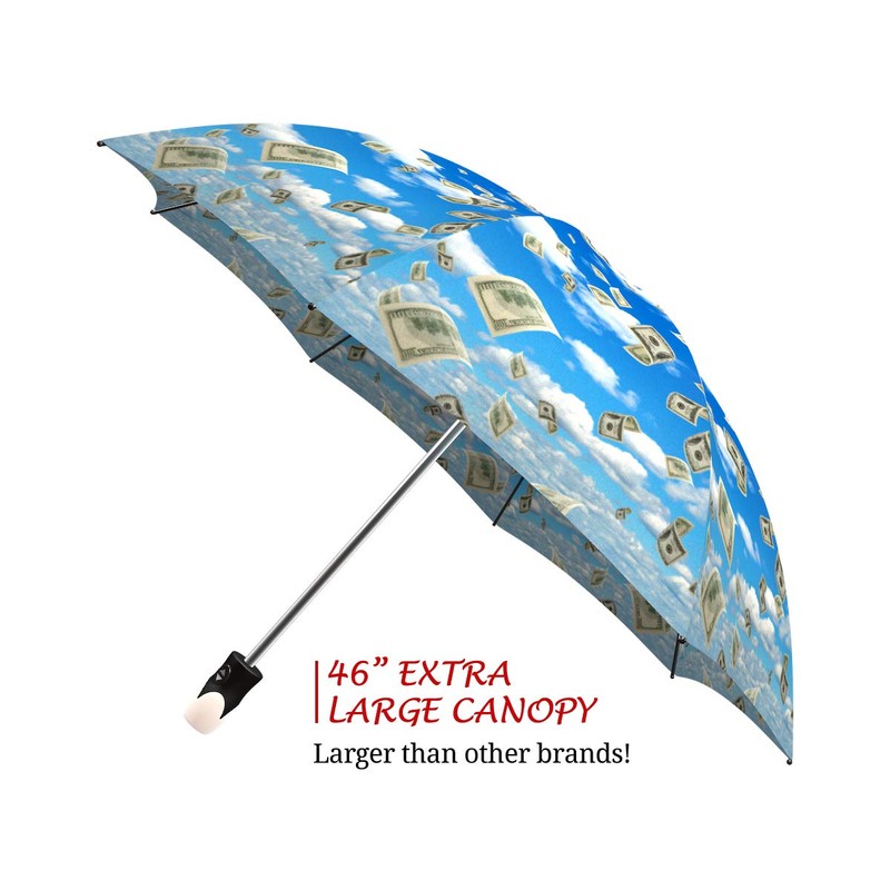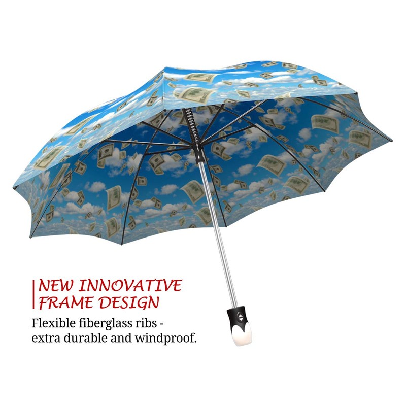 Funny Design Raining Money Umbrella Blue Sky - Auto Open Close - Compact and Portable Small Folding Umbrella, 46 inch Canopy
