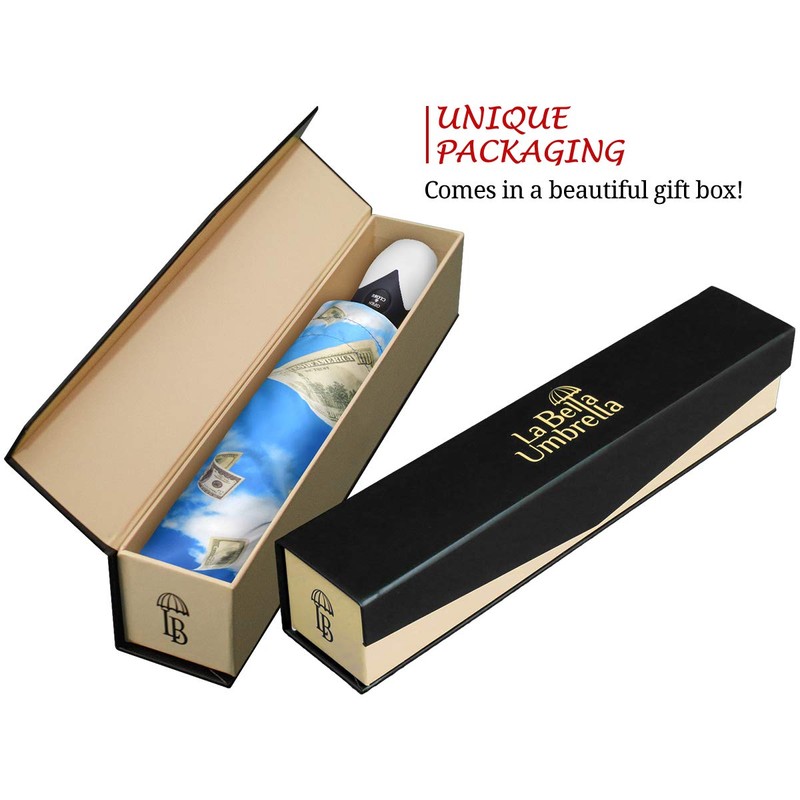 - UNIQUE DESIGN - this funny raining money umbrella design is one of the best umbrella designs for men or women. This big colorful umbrella comes in a beautiful gift box. The print is only on the outside canopy but it is visible from the inside as well. 48 other creative umbrella designs are also available - from cute and funny umbrellas to luxury and fashionable umbrellas. A two year warranty is included. Please contact La Bella Umbrella for any issues.