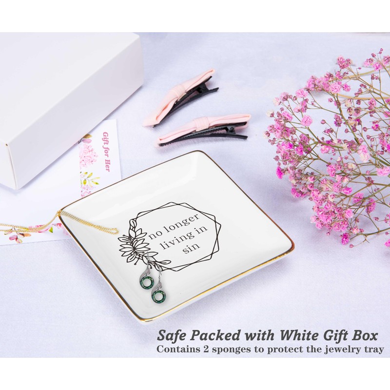 Funny Engagement Newly Engaged Gifts for Woman-Wedding Gift for Bride-Anniversary-Bridal Shower Present-Bachelorette Party Present-Jewelry Tray Trinket Holder Ring Dish-No Longer Living In Sin