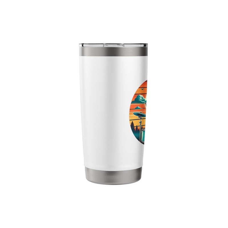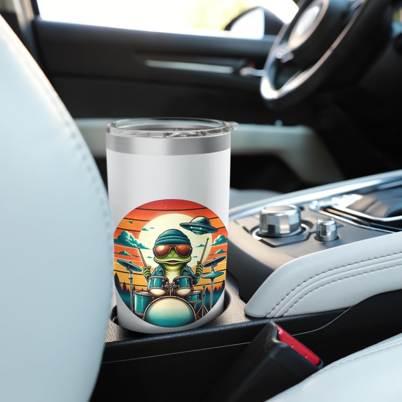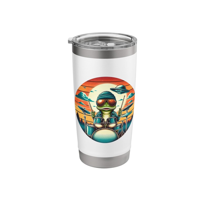 Funny Frog Playing Drums, Retro Vibe with UFO in Sky Stainless Steel Insulated Tumbler