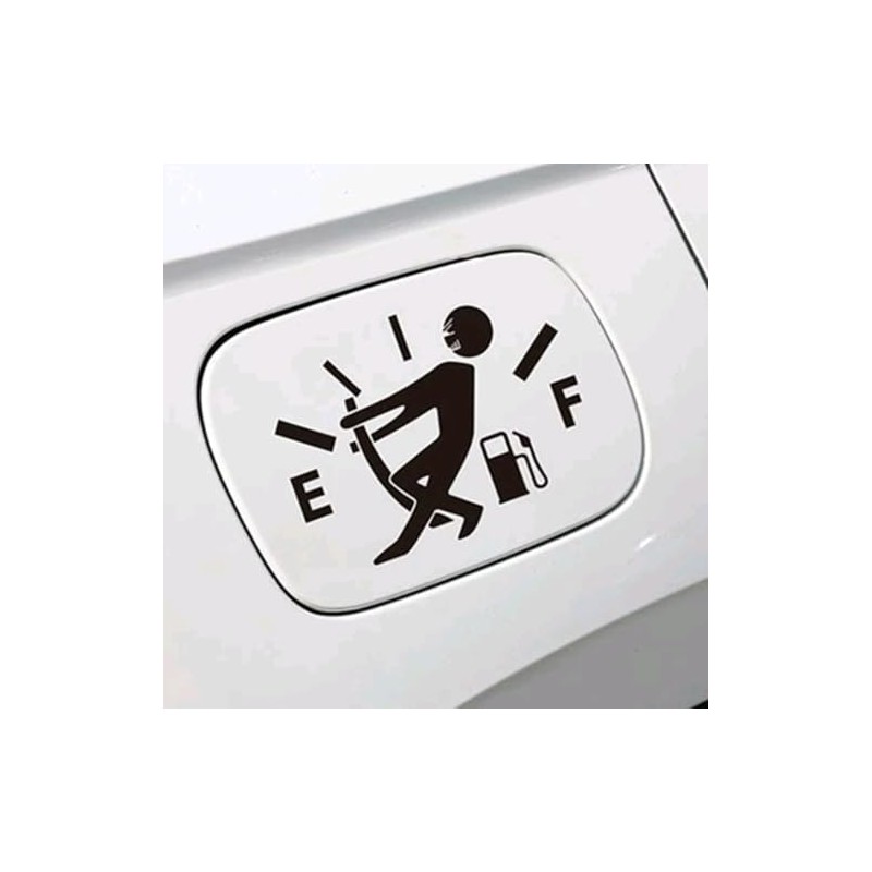 - DESIGN: Humorous stick figure decal showing a character dramatically pulling on gas gauge needle, perfect for fuel door or gas tank area