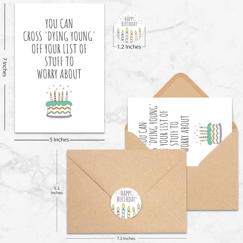 - Witty and Humorous Design: This greeting card features a playful message, "You Can Cross Dying Young off Your List of Stuff to Worry About," making it perfect for adding a touch of humor to any birthday celebration.