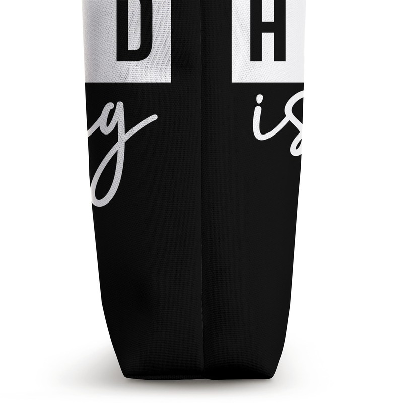 - 16” x 16” bag with two 14” long and 1” wide black cotton webbing strap handles.