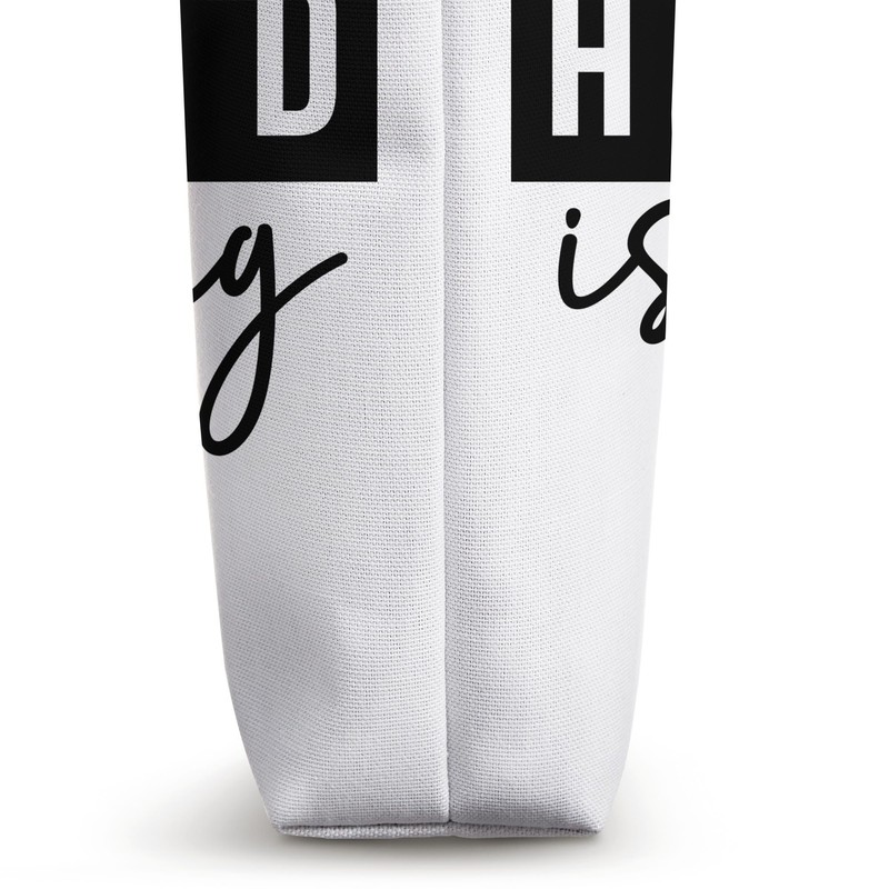 - 16” x 16” bag with two 14” long and 1” wide black cotton webbing strap handles.