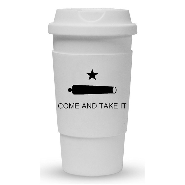 Funny Guy Mugs Texas Come And Take It Travel Tumbler With Removable Insulated Silicone Sleeve, White, 16-Ounce
