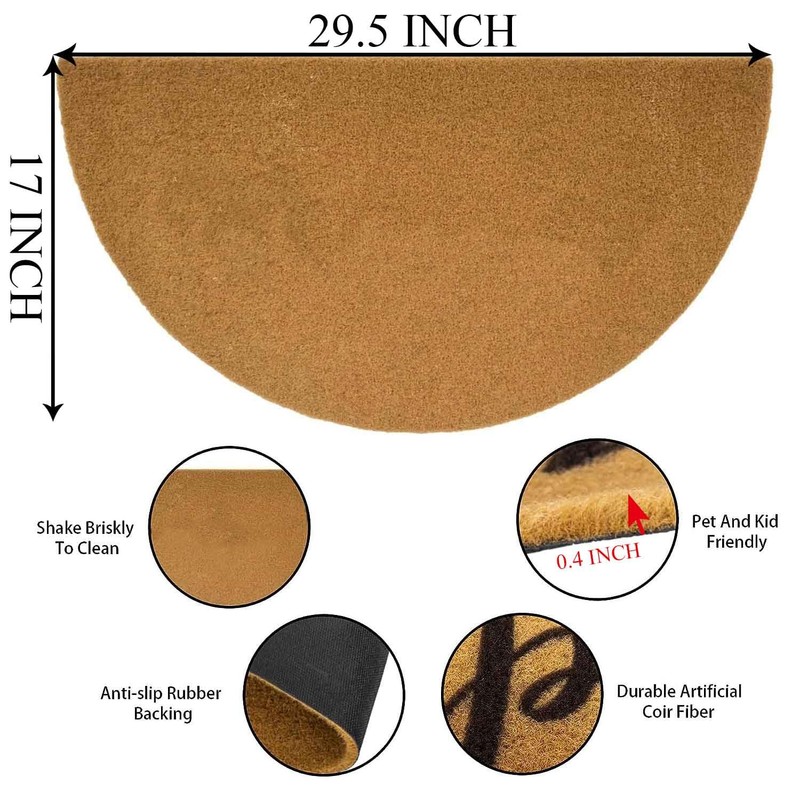 - · ☆Size☆: Measuring 29.5 x 17 inches Half Moon Doormat. Our door mats for outside entry is made of high quality Polypropylene. It comes with a PVC rubber back to ensure it stays in place even during heavy cleaning sessions. our welcome mats outdoor entrance is just the right size for any entryway. It's big enough to accommodate two people standing side by side, yet small enough to fit in front of a single door without overwhelming the space.