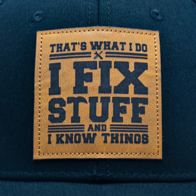 - This trucker hat features a leather patch with the words "THAT’S WHAT I DO, I FIX STUFF AND I KNOW THINGS" A unique and thoughtful gift for dads, brothers, friends or colleagues who loves DIY, tinkering or are specialties at fixing things.