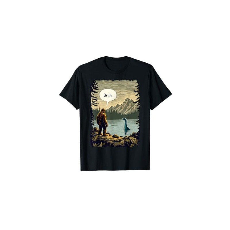 - Funny vintage-style Bigfoot design featuring Sasquatch casually greeting his introverted pal, the Loch Ness Monster with a classic “Bruh.”