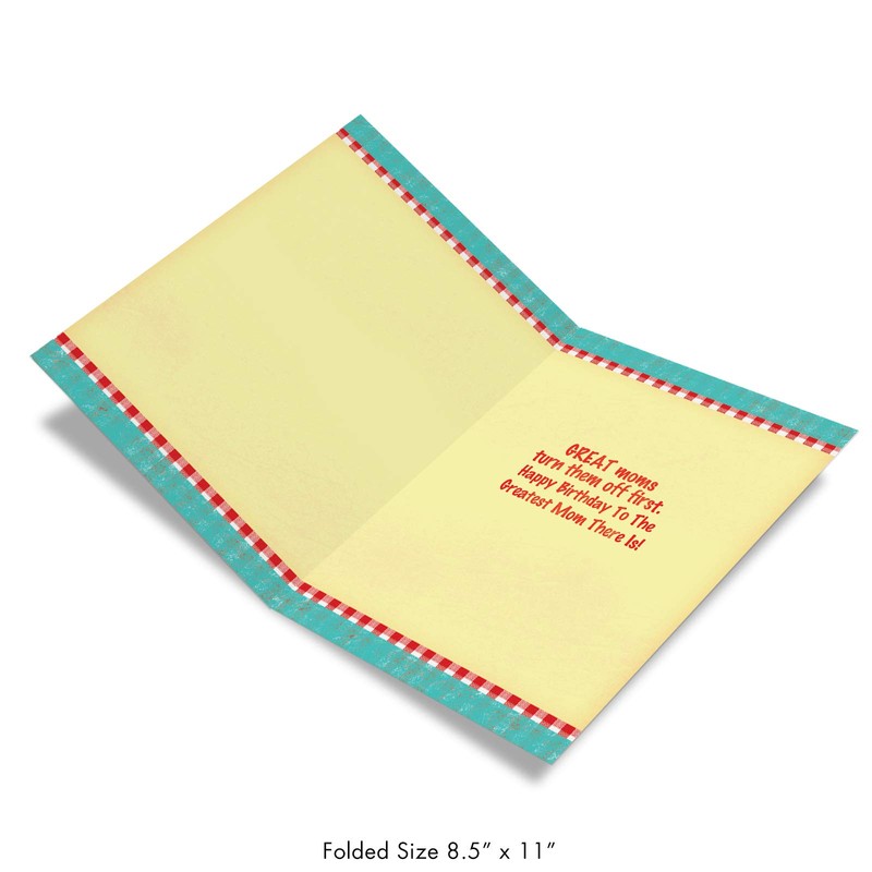 - CARD'S INSIDE SENTIMENT READS: Great Moms Turn Them Off First. Happy Birthday To The Greatest Mom There Is! - How can you tell if your mother is a good mom or a great mom? The card cover classifies good moms as those who let you lick the beater covered in chocolate drippings, while great moms are those who turn the beaters off first. So give this card to your mother, and let her decide where she belongs!