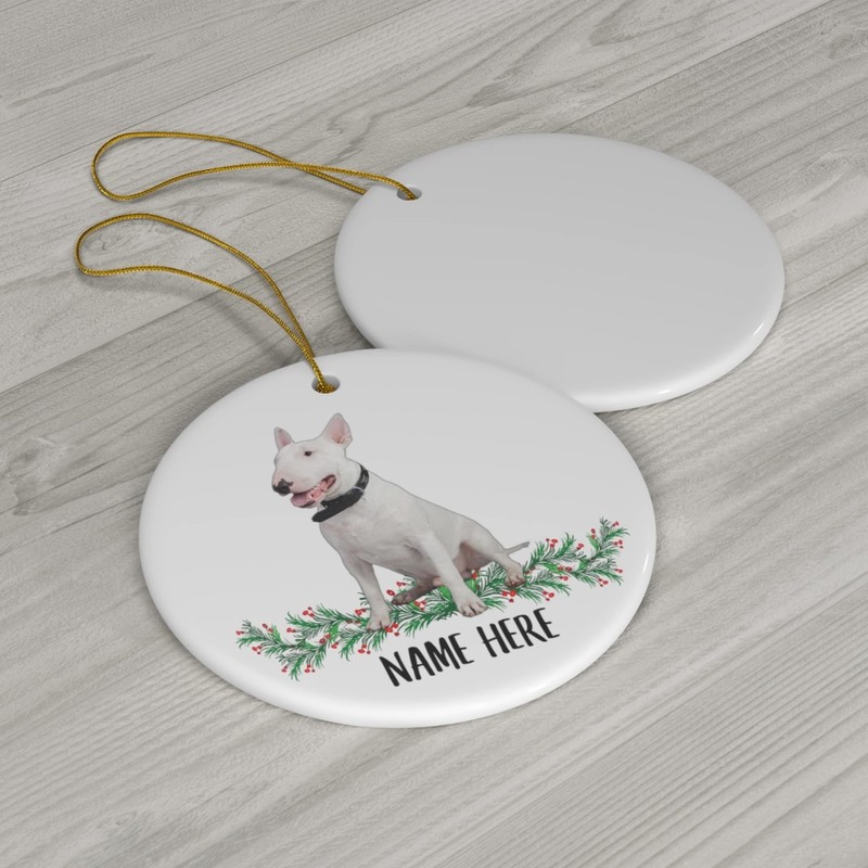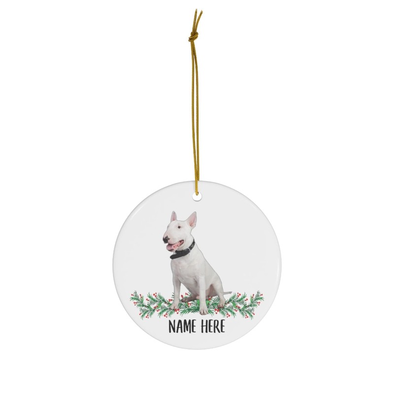Funny Personalized Name Bull Terrier White Gifts 2024 Christmas Tree Ornaments Circle Ceramic