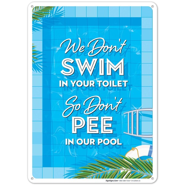 Funny Pool Sign, We Don't Swim in Toilet Don't Pee in Our Pool Sign, 10X14 Rust Free Aluminum, Weather/Fade Resistant, Easy Mounting, Indoor/Outdoor Use, Made in USA by Sigo Signs