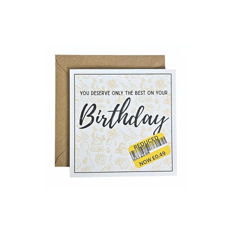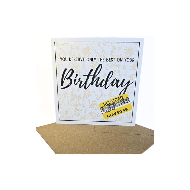 - DESIGN FEATURES: Humorous birthday card featuring gold party-themed illustrations and a reduced price sticker design on premium white card stock
