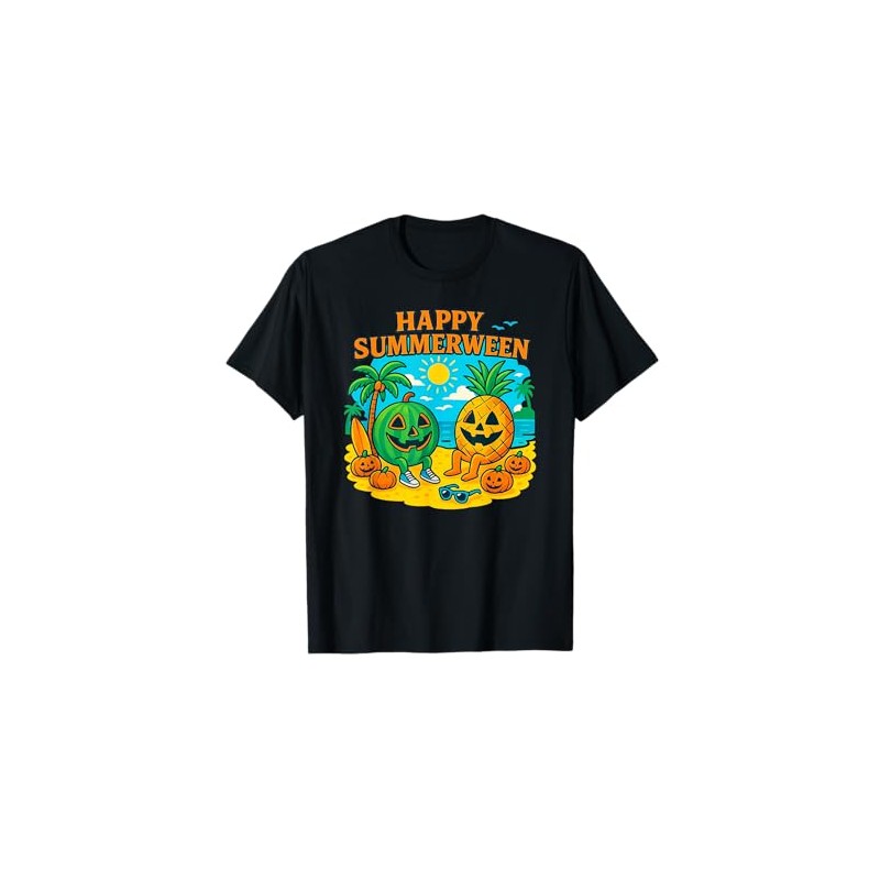 - Bring the haunted heat to the beach with this hilarious Happy Summerween design! Featuring a tropical twist on Halloween, this artwork shows a smiling pineapple jack-o’-lantern and a watermelon pumpkin relaxing in the sand next to a surfboard and palm tree