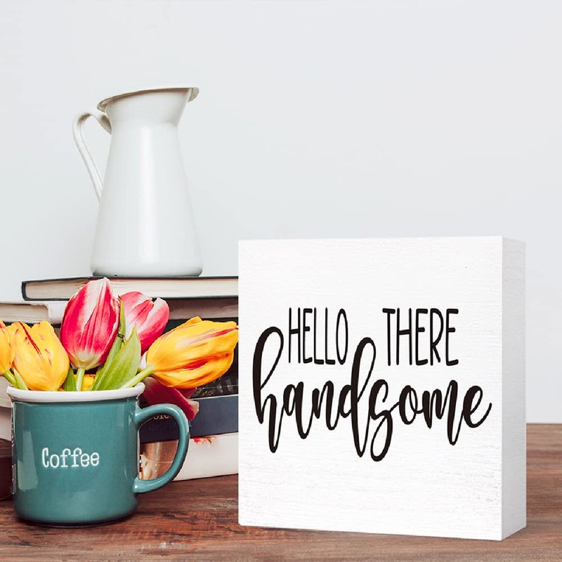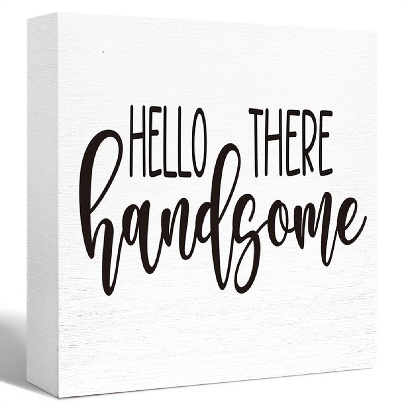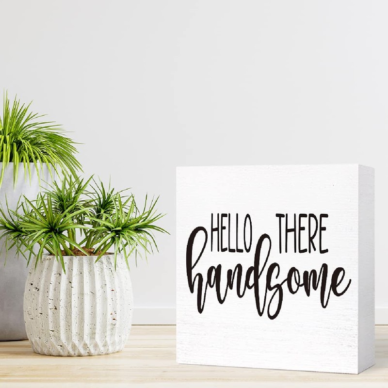 Funny Wood Sign Hello There Handsome Gorgeous - Wooden Block Sign for Shelf, Toilet, Restroom, Home, Tabletop, Desk Decor, Farmhouse Bathroom Box Sign