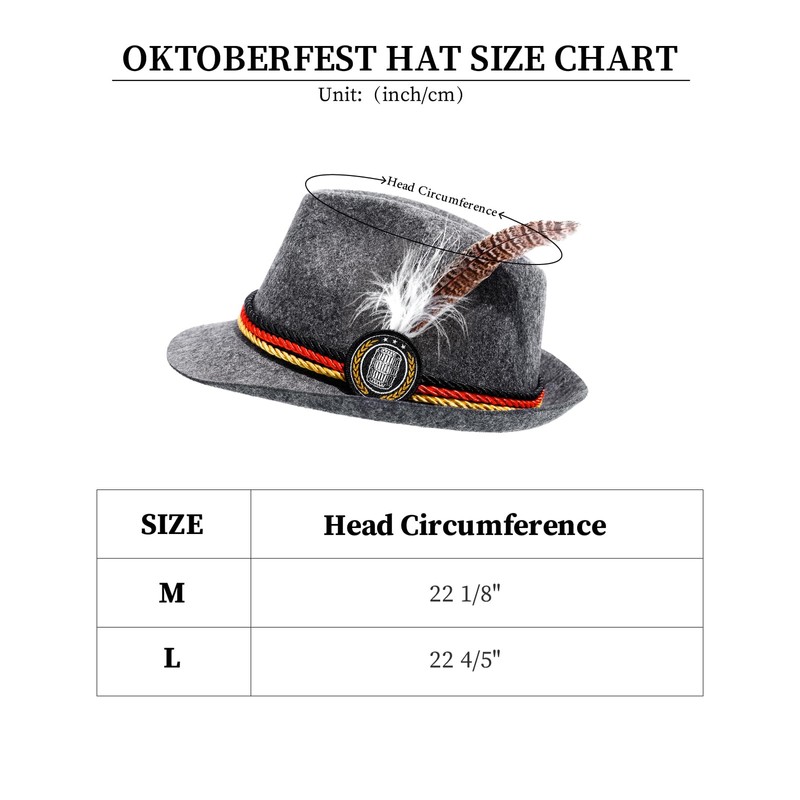 - Unisex Adult style. Oktoberfest hat is made with feather and three-color spiral rope. Glued with an unique embroidery barrel printing logo