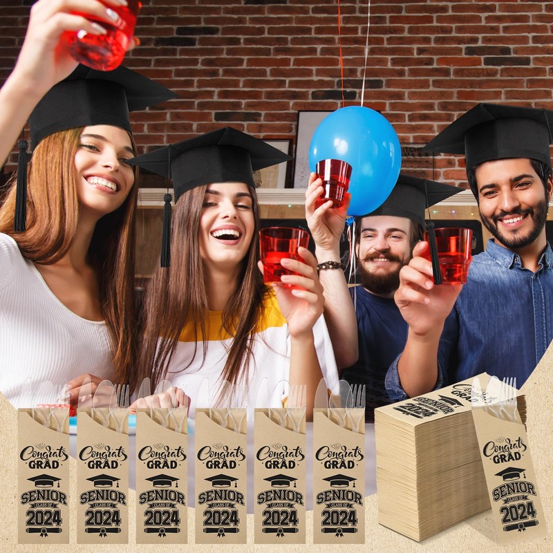 - Celebrating Milestones: this graduation themed set complete with paper silverware bags designed with the graduation cap and 'Class of 2024' pattern; It's the nice fit for a graduation theme party that will have your guests admiring your creative party decorations