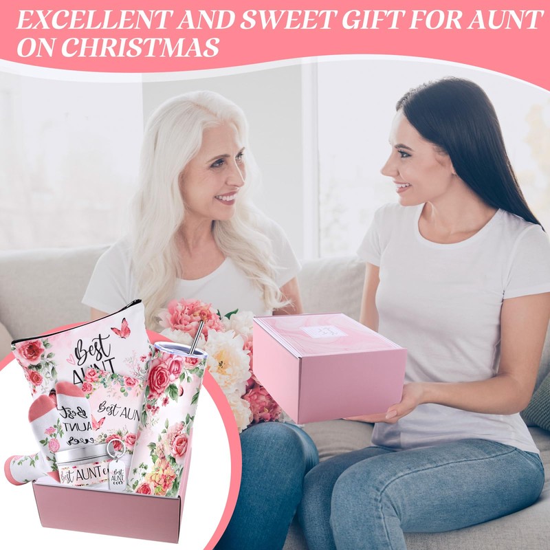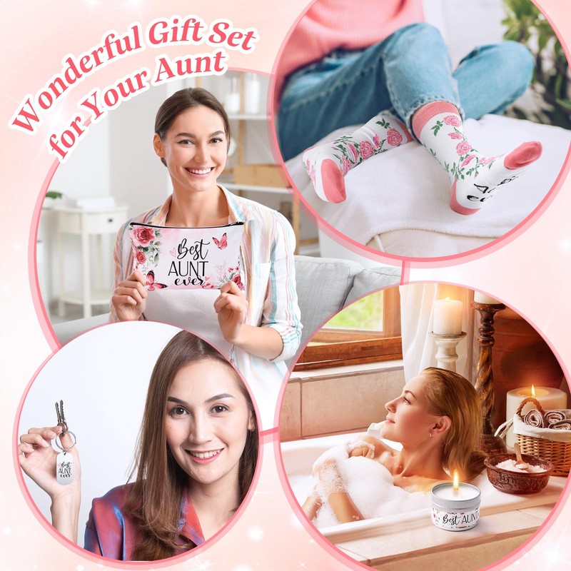 - Aunt Gifts Basket Set: our 7-piece gift set is thoughtfully assembled to include a 20 oz water tumbler, a makeup bag, a lavender-scented candle, a keychain, a greeting card, a pair of socks, and a beautifully designed gift box. It's the ideal way to express your appreciation for aunt, to be aunt, promoted to aunt, pregnancy announcement